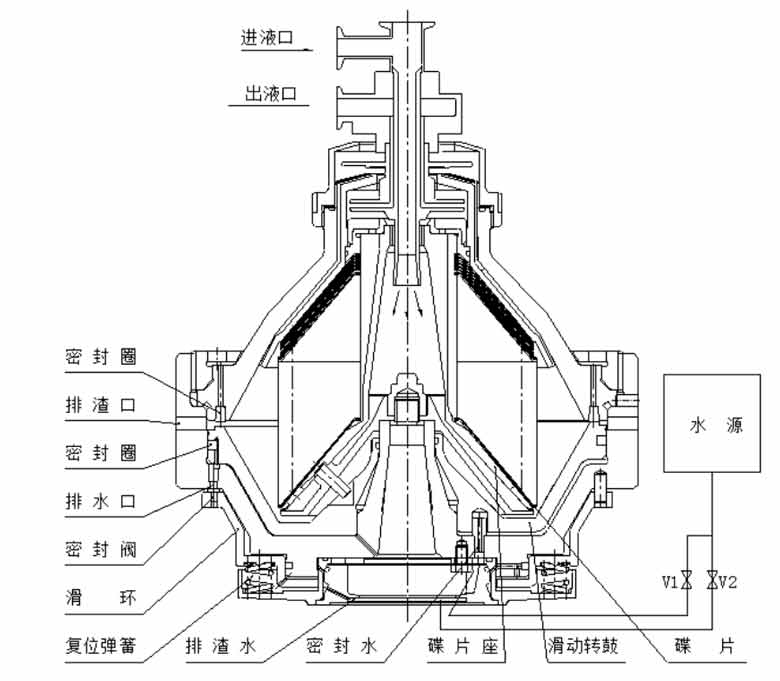 別離質料經(jīng)過固定進料管進入旋轉轉筒中的分配器,在那里,它以別離機轉筒的圓周速度進行加快,分配混合物時不會產(chǎn)生撞碎細顆?;驖嵋旱募羟辛?。在分配器底座外緣設備開口或孔眼,物料別離時可經(jīng)由此進入別離沉降層。被別離后的液體經(jīng)由錐形碟片外錐面向軸心活動至上部經(jīng)輕液向心泵由輕液口排出。
